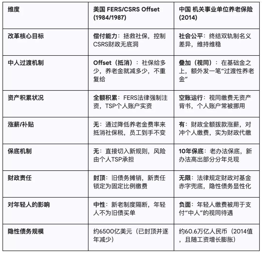 最终,美国通过1983年改革,成功让濒临破产的社保体系(基金仅够几个月养老金发放)延续到了2035年,并且永久性地斩断了需要不断输血的公务员养老体系,有效控制了财政压力(即年轻人养老负担);而中国2014年改革只是做到了形式上的统一,实际上让体制内外的差距和财政压力越来越大,把危机推向未来那个深度老龄化的社会。