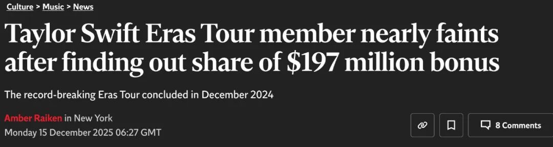 在Eras Tour巡演结束后,她给舞者、乐手、司机、灯光师等幕后团队分发了近2亿美元的奖金----不是噱头,是实打实的钞票。