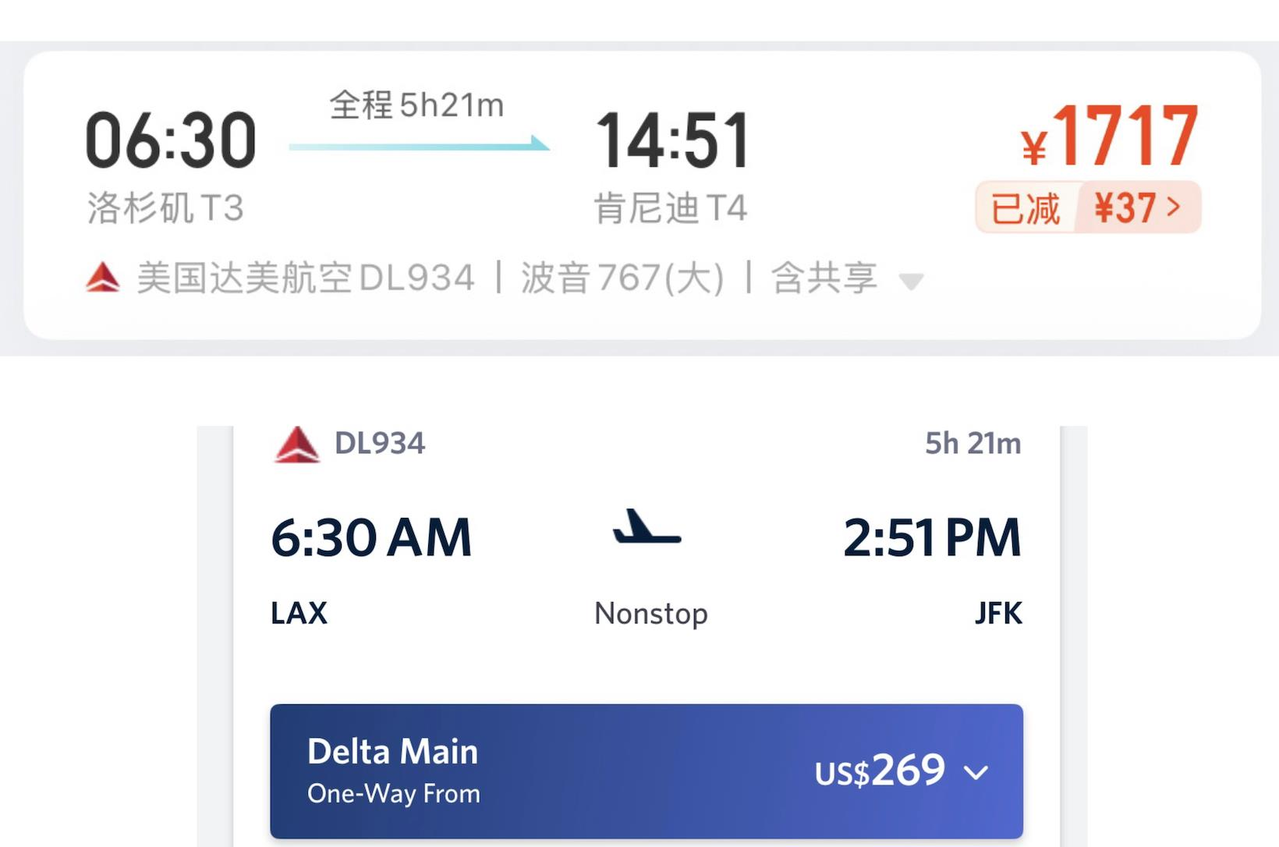 为进一步了解价差情况,记者在中国旅游平台「去哪儿」进行随机测试。以12月31日单程自洛杉矶飞往纽约为例,达美航空一航班在去哪儿显示价格为1717元人民币,约合244美元;而在达美航空官网查询相同航班,票价则为269美元,两者相差约25美元,尽管差额不大,也是一笔优惠。