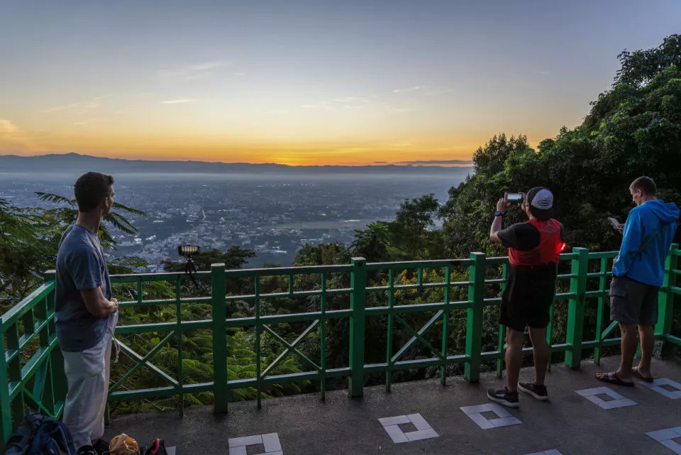 当地时间2025年10月28日,泰国清迈,冬季雾气笼罩城市,游客用手机拍摄日出。(视觉中国/图)
