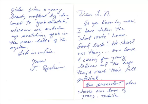 爱泼斯坦还写道:“亲爱的L.N.(拉里.纳萨尔缩写):想必你现在已经知道,我已选择‘捷径’回家(指自杀)。祝你好运!我们有一个共同点…… 我们都‘关爱’年轻女性,并希望她们能充分发挥自身潜力。我们的总统也和我们一样喜欢年轻性感的少女。”