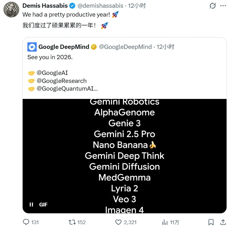 看看 Demis Hassabis 晒出的这张年度成绩单,Gemini 3、Genie 3、Veo 3、Nano Banana... 确实硕果累累。