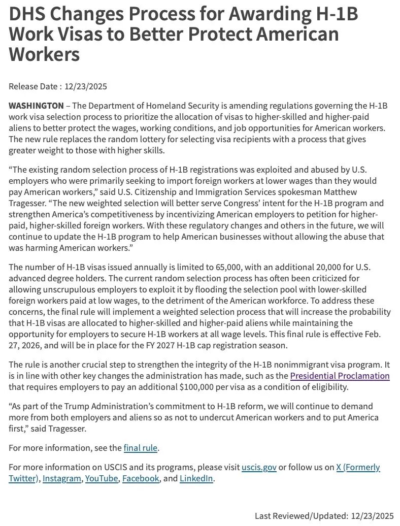12月23日,美国国土安全部(DHS)与美国公民及移民服务局(USCIS)正式确认了一项重磅移民改革:从传统随机抽签制切换为按工资水平加权抽签的全新 H-1B 签证选择机制。