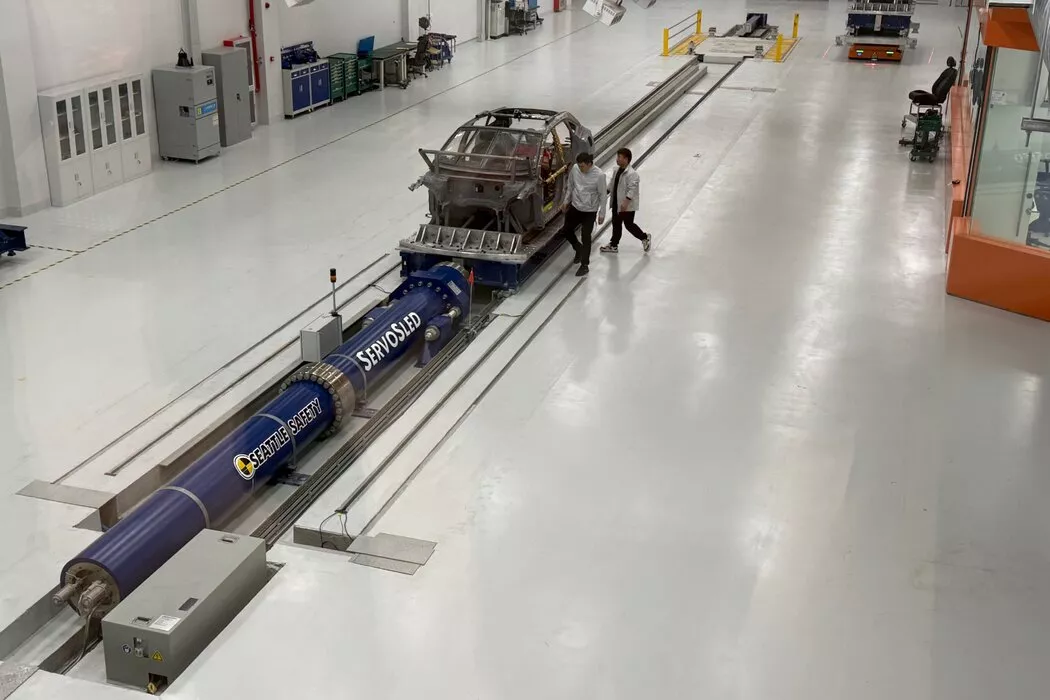 吉利在中国宁波的新安全中心,一台强大的滑轨加速器正在进行碰撞测试。Keith Bradsher/The New York Times