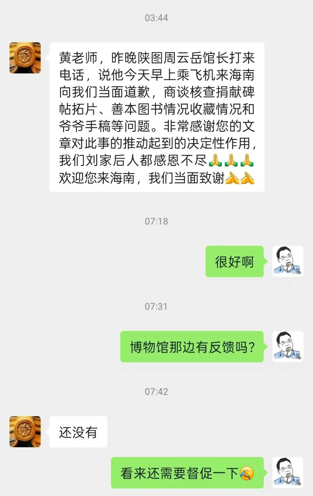 12月23日晚,陕西省图书馆馆长联系刘军山之孙刘渭,表示将于24日早上飞赴海南,向刘渭、高燕夫妇当面道歉,并商谈核查捐献碑帖拓片、善本图书收藏情况和刘军山手稿问题。