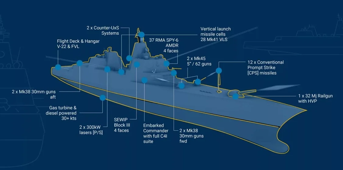 在设计上,美国海军宣称将用人工智能(AI)辅助设计,考虑到目前人工智能所达到的水平,这存在一定的合理性,但AI也并非完全的灵丹妙药,因为复杂设计仍然非常耗费时间,大型、复杂的舰船平台则需要更高的成本。在发布会上展示的设想图中,这艘新式战列舰存在相当多和“阿利·伯克”级相似之处,但其尺寸更大,设想图描绘了其发射导弹、炮弹和定向能武器的样子。事实上这些想象图也很像是此前下一代导弹驱逐舰DDG(X)设想图重新绘制和利用的结果,相同的是它们都有前后分布式的上层建筑、前舰桥上有一根封闭式主桅杆。而五角大楼公告也证实,它将取代名义上的DDG(X)。
