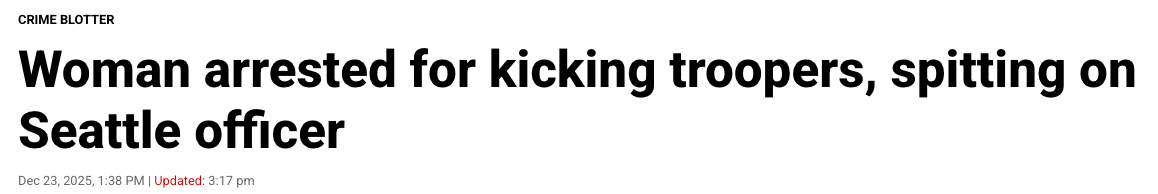 然而,警员将嫌疑女子押上警车后,她据称开始踢打并攻击两名华州巡警。随后西雅图警局一名中士到场处理事件时,该名女子还向其吐口水。