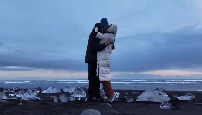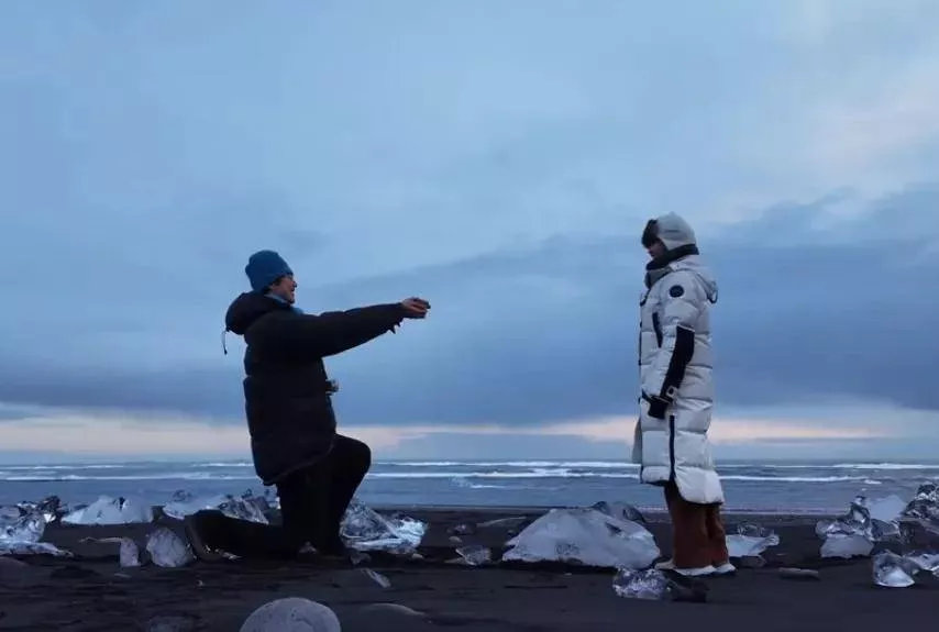 从两人穿搭来看,这场求婚还是比较随性,孙丞潇黑色羽绒服搭蓝色帽子,金莎银色羽绒服、灰色帽子搭红裤子,也算是“红蓝CP色”了。而他们选择的求婚地点也有美好的寓意,“钻石沙滩”象征爱情像钻石和冰川一样永恒。