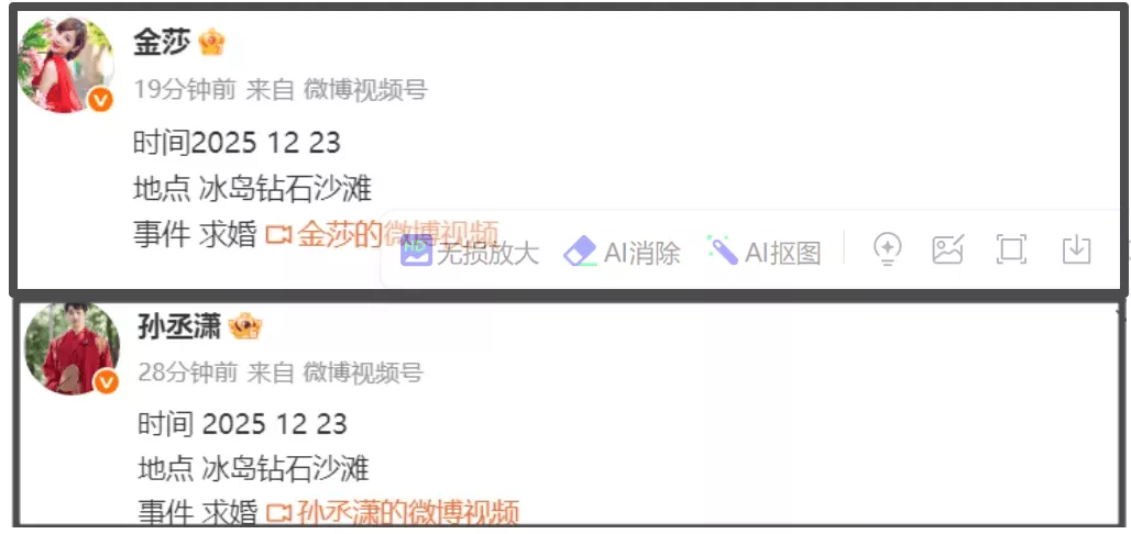 金莎跟孙丞潇传来好消息!金莎在微博晒了求婚画面,透露孙丞潇在12月23日于冰岛的钻石沙滩完成求婚,随后孙丞潇也发微博官宣,引发热议。
