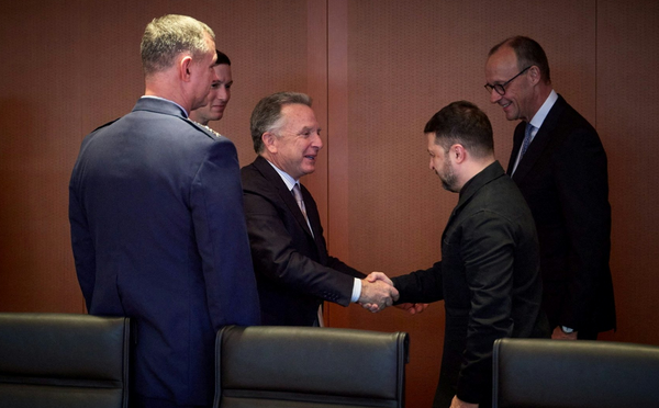 2025年12月14日,乌克兰总统泽连斯基(Volodymyr Zelenskiy)在德国柏林,与美国中东问题特使威特科夫(Steve Witkoff)握手。(Ukrainian Presidential Press Service/Handout via REUTERS)