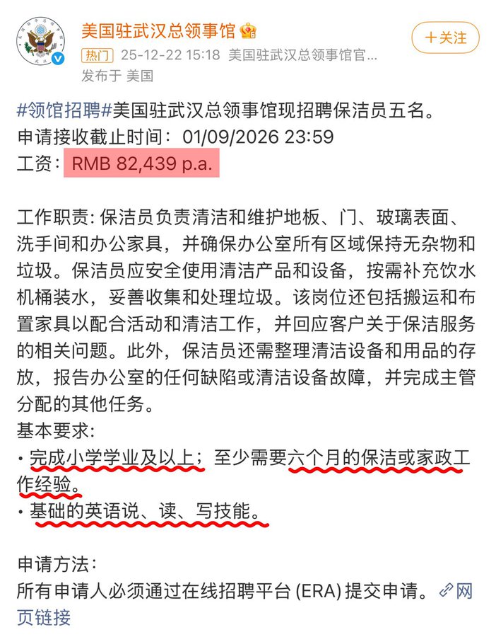 美国驻武汉总领馆招保洁员,年薪8万多,竟然给出了精确到个位数的精确工资数,并且学历只要求小学毕业即可…… 对比之下,国内不少行业一边高喊“内卷”“降本增效”,一边以年龄为隐性门槛,把35岁以上的劳动者推向边缘。 这比一个北方县市区的公职人员工资都高,过分了。 一年8万2,月均6千多,交个社保,个税,到手5千多块钱,还得会英语,还得听说读写都没问题,给这点儿钱儿,堂堂大美利坚,就这点儿实力?