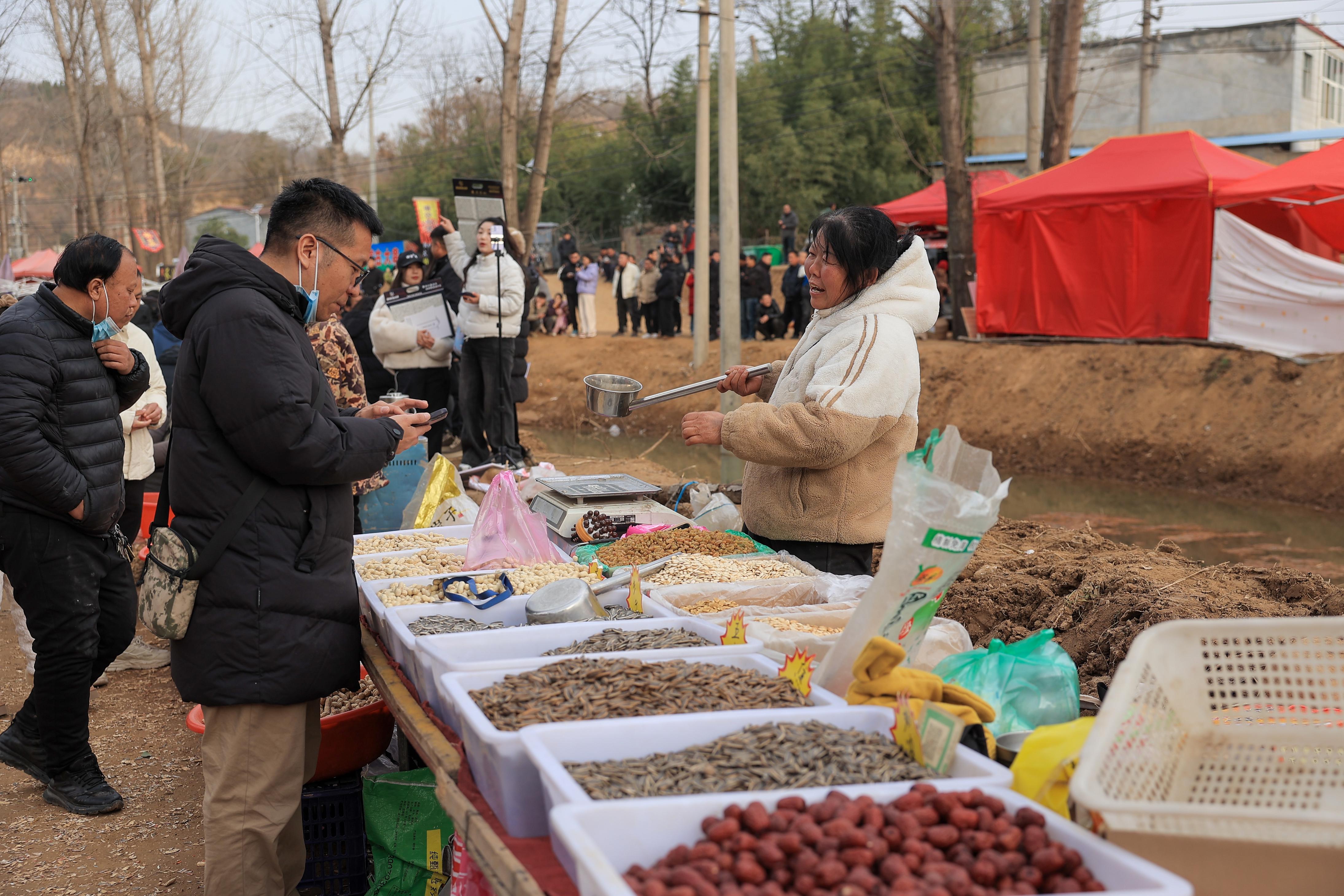 23日下午3点多,进入梨园河村的乡道上已经停了不少车辆。泉眼附近,多名志愿者和社区工作人员在引导车辆进出。村里小路两侧,聚集着许多摊贩,叫卖声不绝于耳。