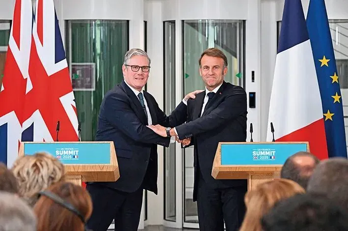 2025年7月10日,英国首相斯塔默(左)与法国总统马克龙在英国伦敦郊外诺斯伍德军事基地举行联合记者会 吴鲁摄/本刊