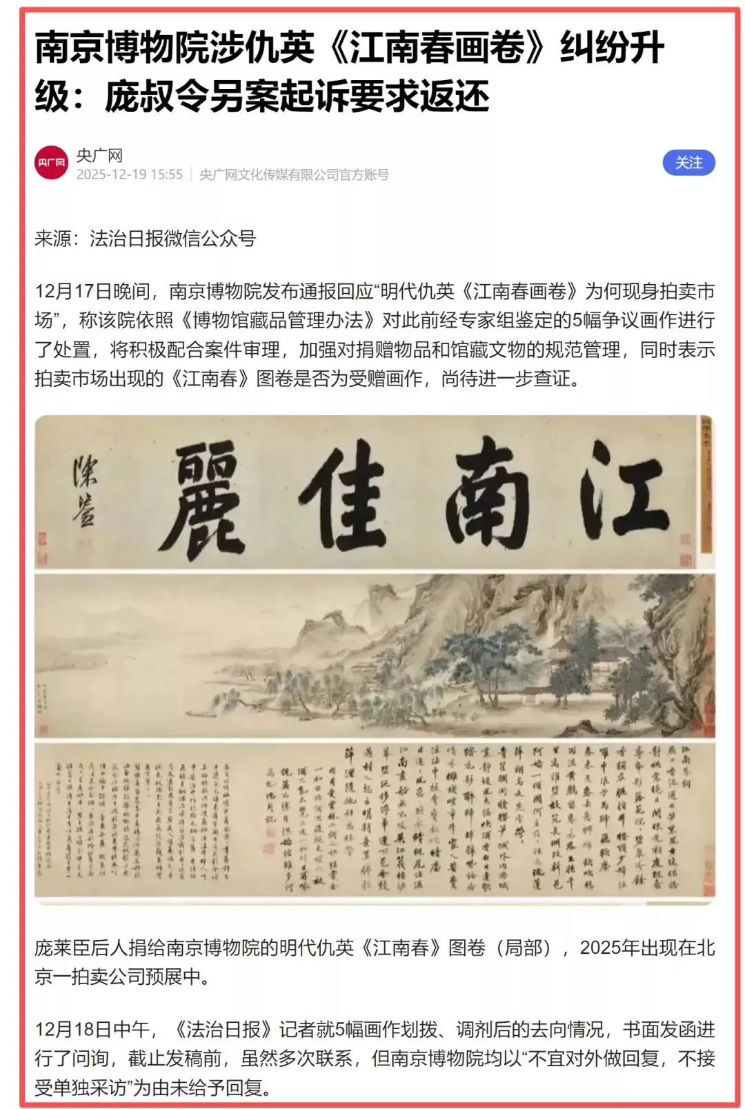 南京博物院与庞莱臣后人的文物纠纷持续发酵,明代仇英《江南春》图卷离奇上拍、四件捐赠文物莫名失踪,院方以“伪作”为由模糊处置去向的回应,不仅暴露了馆藏管理的乱象,更牵出了长期存在的文物处置顽疾——从文革时期康生等人的公开劫掠,到江苏省委老同志借占文物不还,再到当代馆藏的违规处置,本质都是同一病根在不同时代的复发:权力凌驾于法治之上,公共与私人财产沦为权力可随意支配的资源,所谓“时代差异”不过是权力越界的表现形式不同,核心的特权逻辑从未改变。