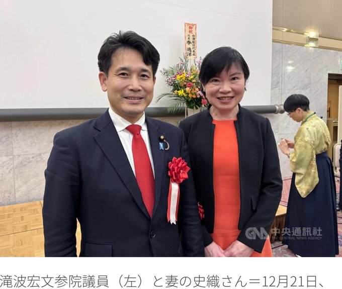 滝波的背景,正好让他成为这项工作的关键人物。他出身福井县,东京大学法学部毕业,曾任职于大藏省,并外调到法务省刑事局、内阁官房工作。熟悉法律与官僚体系运作。进入政界后,历任经济产业大臣政务官、参议院农林水产委员长、自民党水产部会长与农林水产副大臣,是日本政坛标准的菁英路线。 但比履历更重要的,是他的“台湾女婿”身份。演讲最后他提到,太太已在今年完成户籍出生地更正,从“中国台湾省台北市”改为“台湾台北市”。那一刻,他深刻感受到,制度终于回应了现实。