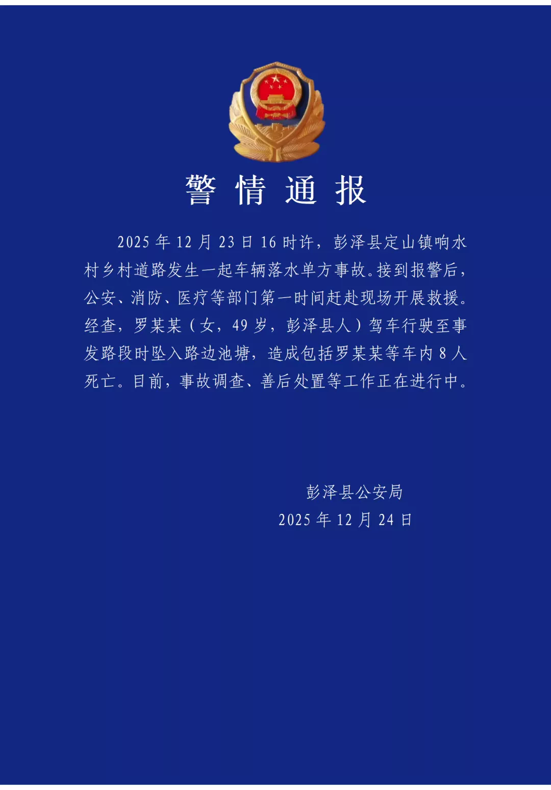 2025年12月24日,江西省九江市彭泽县公安局通报:12月23日16时许,彭泽县定山镇响水村乡村道路发生一起车辆落水单方事故。经查,罗某某(女,49岁,彭泽县人)驾车行驶至事发路段时坠入路边池塘,造成包括罗某某等车内8人死亡。