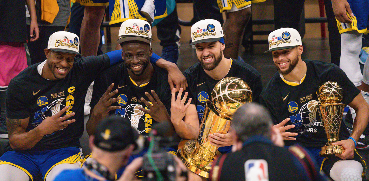 勇士的柯瑞(右一)、汤普森(右二)搭档在2022年第四次夺冠。(本报档案照)