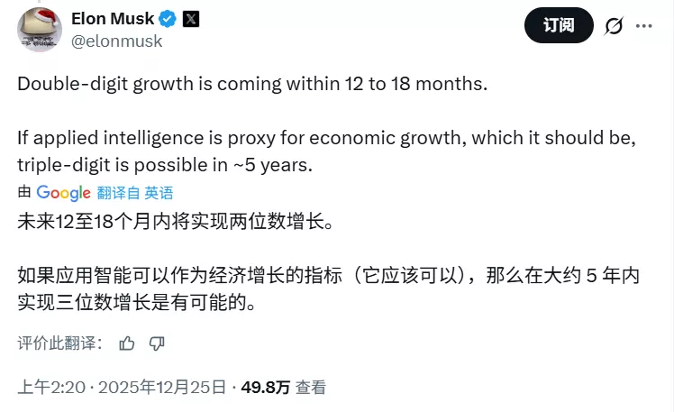 周三马斯克在X平台发文称,如果将应用智能视为美国经济增长的代理指标,"大约五年内可能实现三位数增长"。这番言论的发布时机恰逢美国经济数据走强。