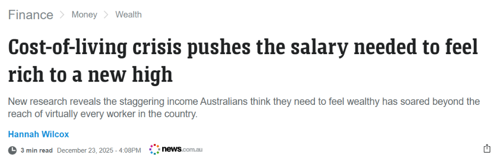 但比价网站Finder的最新调查显示,随着生活成本飞涨,如今澳洲人认为要“感觉自己有钱”,年薪必须高达38.9万澳元!