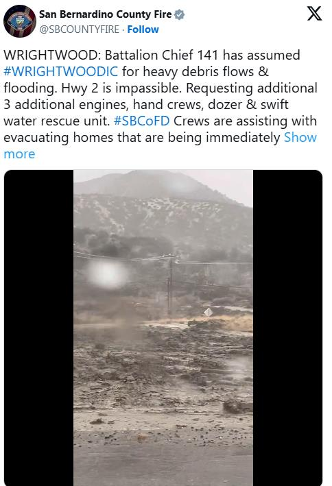圣伯纳汀诺县消防局发布的泥石流场景。(圣伯纳汀诺县消防局X)