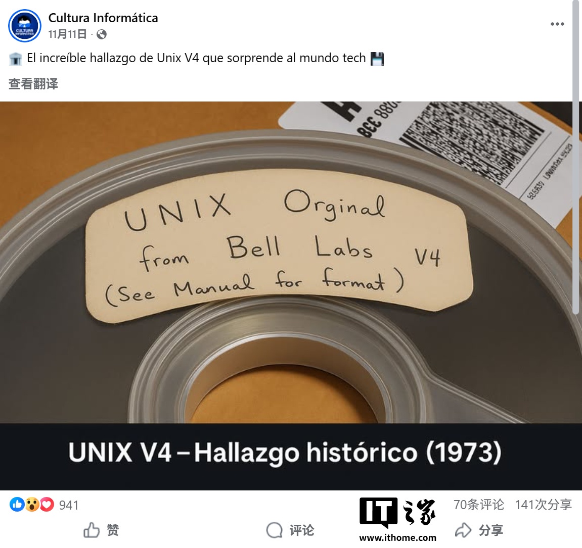 科技媒体 Tom's Hardware 昨日(12 月 24 日)发布博文,犹他大学计算机学院近期意外发现并成功恢复了一卷极为珍贵的磁带,其中存储着 Unix v4 操作系统的唯一已知副本。