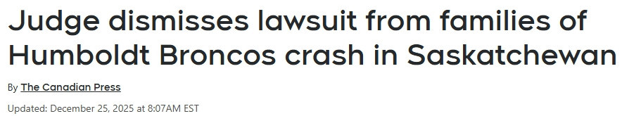 萨斯喀彻温省一名法官近日裁定,驳回了洪堡野马队(Humboldt Broncos)致命车祸中遇难者家属提出的民事诉讼。 在上周公布的裁决中,位于里贾纳的国王法庭(Court of King’s Bench)法官Graeme Mitchell明确表示,家属的指控在法律上站不住脚,缺乏成立依据。 他在12月16日的裁决书中写道:“即便假设诉状中提出的所有指控都属实,这起诉讼也显然注定失败。”