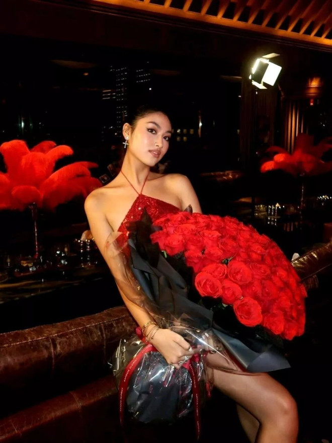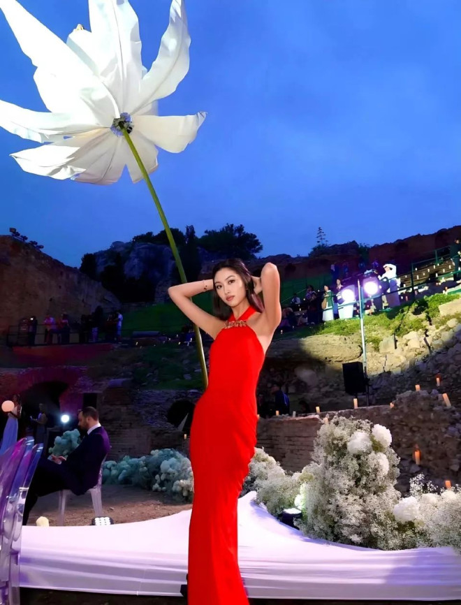 照片里她站在海滩边,身穿红色露肩短裙,手捧着红玫瑰,阳光洒在身上,不仅把180cm的高挑身材衬得淋漓尽致,那优越的肩颈线条和明艳大气的港风浓颜,更是让网友直接喊出“星二代颜值天花板”的赞语。
