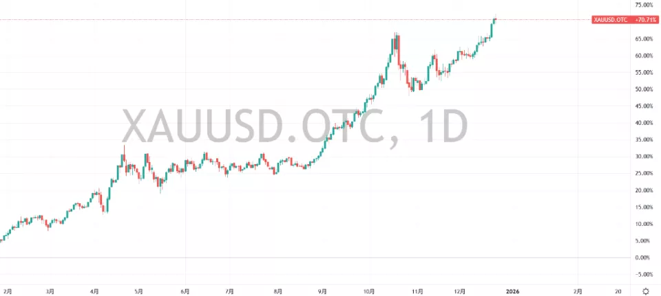 黄金同样表现抢眼,现货金价在12月24日触及每盎司4525.18美元的历史新高,尽管随后回落但全年涨幅依旧超过70%,有望创下1979年以来最佳年度表现,成为一个多世纪以来第二强劲的年度涨幅。