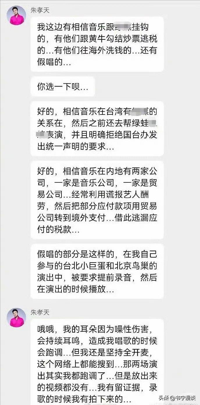 朱孝天终于彻底撕破了脸,公开在粉丝群指控相信音乐涉嫌跟黄牛勾结、立场问题、逃税、假唱等,说的有鼻子有眼,甚至说自己都去配合调查了,跟真事一样。