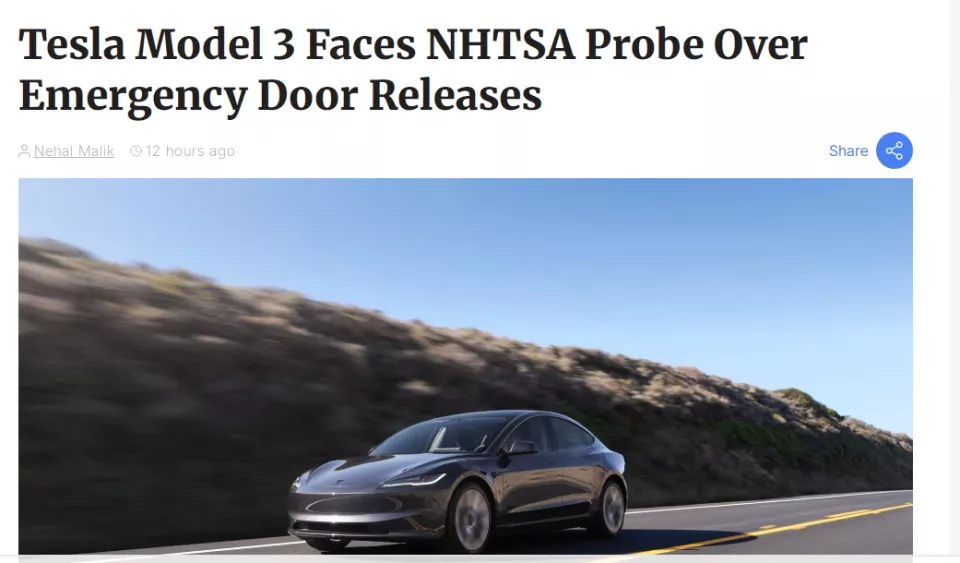 美国国家公路交通安全管理局因此正式发起缺陷调查,聚焦于“手动释放装置在紧急情况下过于隐蔽、难以找到”的指控。