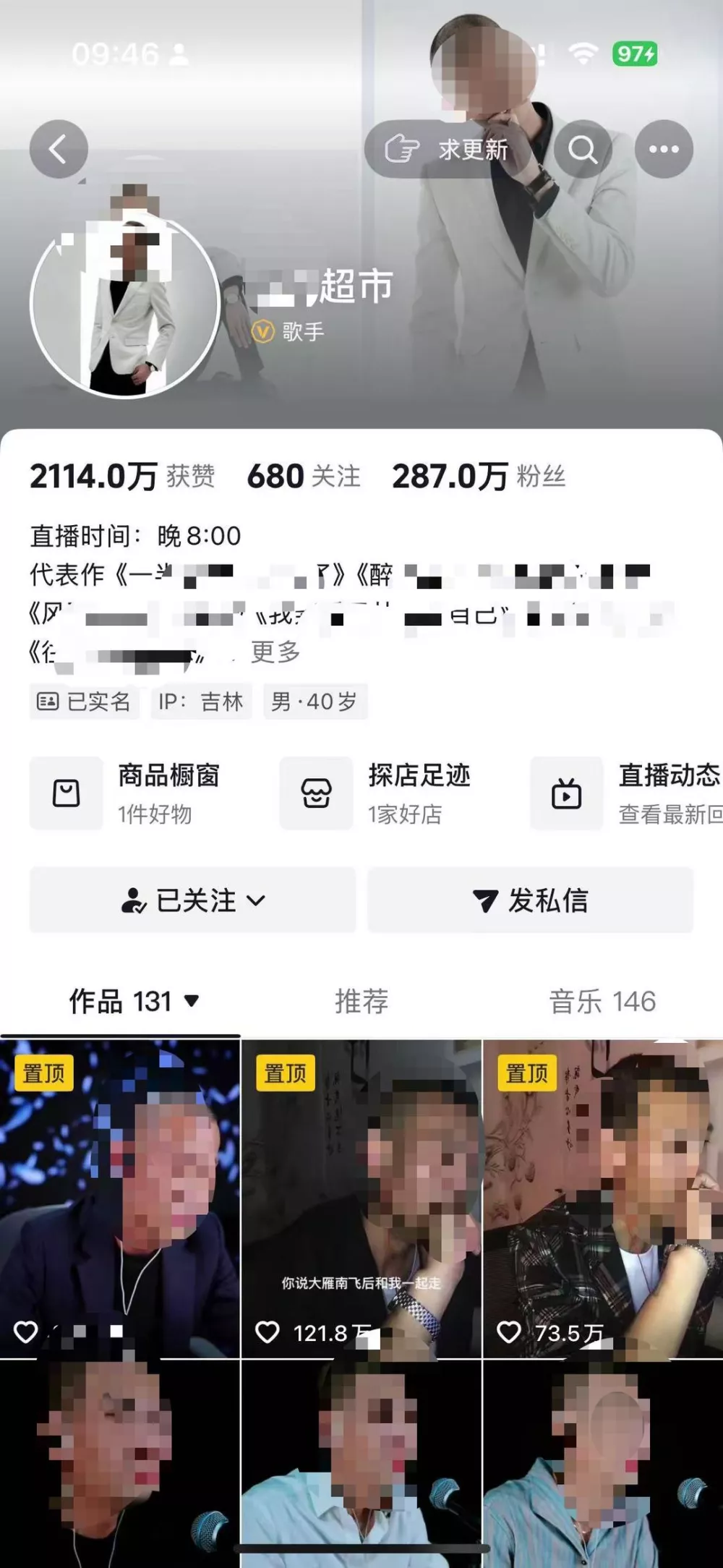公开的抖音账号显示,“某某超市”认证为“歌手”,性别“男”,年龄“40”。账号备注为“热歌追踪者、歌曲追随者”,目前拥有287万粉丝,发布有131个唱歌视频作品,获得2114万赞。