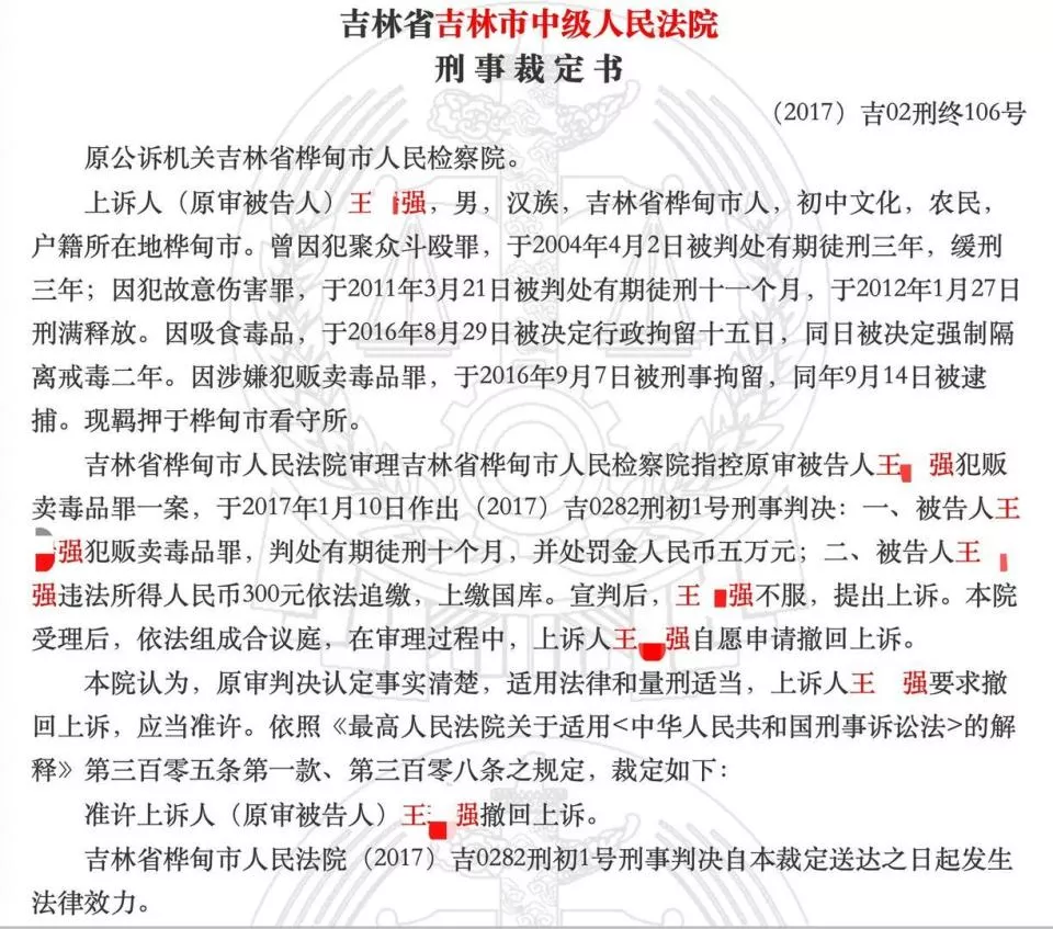 2017年1月10日,桦甸市人民法院作出一审宣判,判决被告人王某强犯贩卖毒品罪,判处有期徒刑十个月,并处罚金人民币五万元;被告人王某强违法所得人民币300元依法追缴,上缴国库。2017年3月24日,吉林市中级人民法院作出刑事裁定书,裁定准许上诉人(原审被告人)王某强撤回上诉。此外,裁判文书网还公开了两份“终结本次执行程序”的执行裁定书,执行内容为罚金和责令退赔的金额,终结本次执行的原因为“未发现被执行人王某强有财产可供执行”。