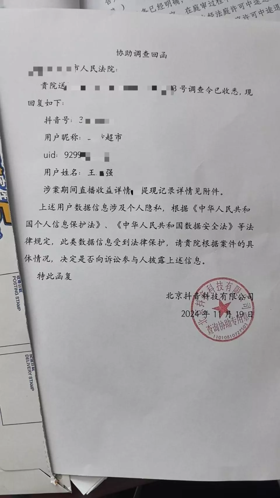 北京抖音科技有限公司向某法院出具的“协助调查回函”显示,“某某超市”抖音账号的用户姓名为王某强。