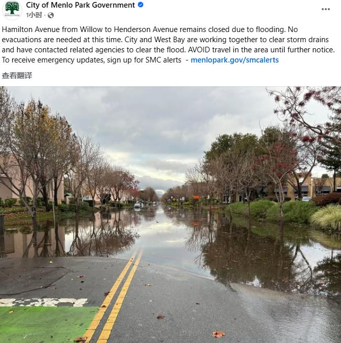 受持续降雨影响,南湾蒙洛公园市(Menlo Park)周三凌晨多条街道出现积水,水位迅速上升,警方与消防人员挨家挨户敲门,提醒靠近Meta总部一带的居民可能需要紧急撤离。