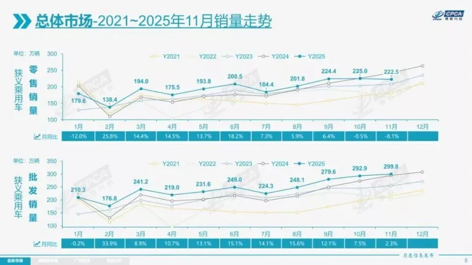 往年这时候,车市该热闹了:你想啊,经销商年底冲量、新能源购置税全免倒计时,销量通常该“翘”起来。但今年11月,乘用车零售量不仅同比下滑8.1%,环比也罕见地下降了1.1%。