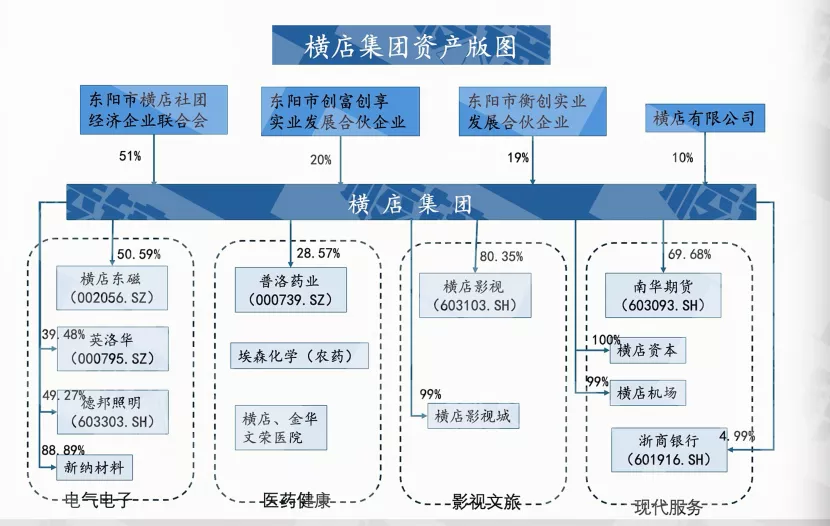 (横店集团股权结构及资产版图,作者制图横店集团资产庞大,仅展示部分重点公司直接持股比例)