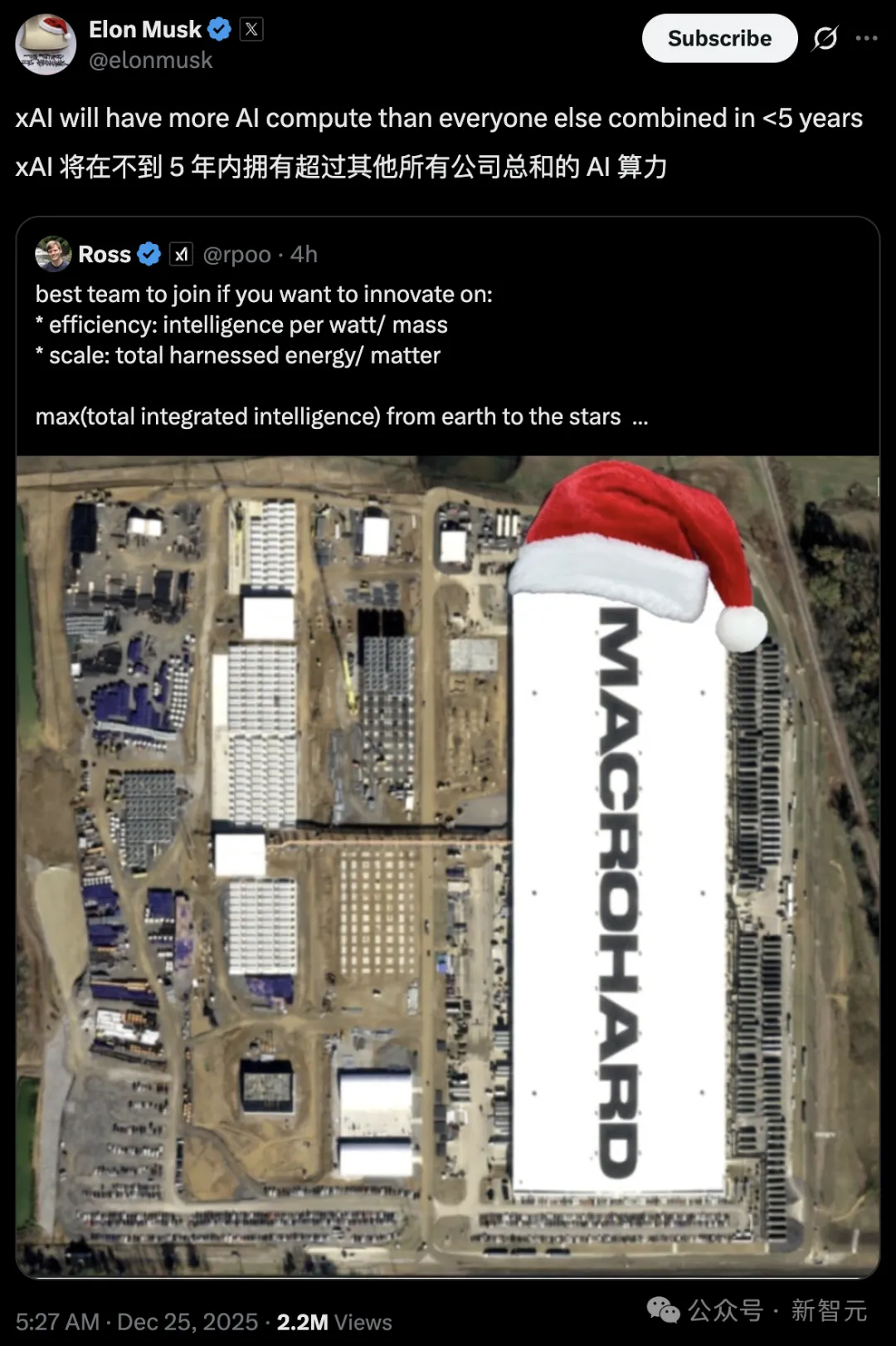 他在X平台上放话:xAI在不到5年内,将拥有超过其它所有公司总和的AI算力。