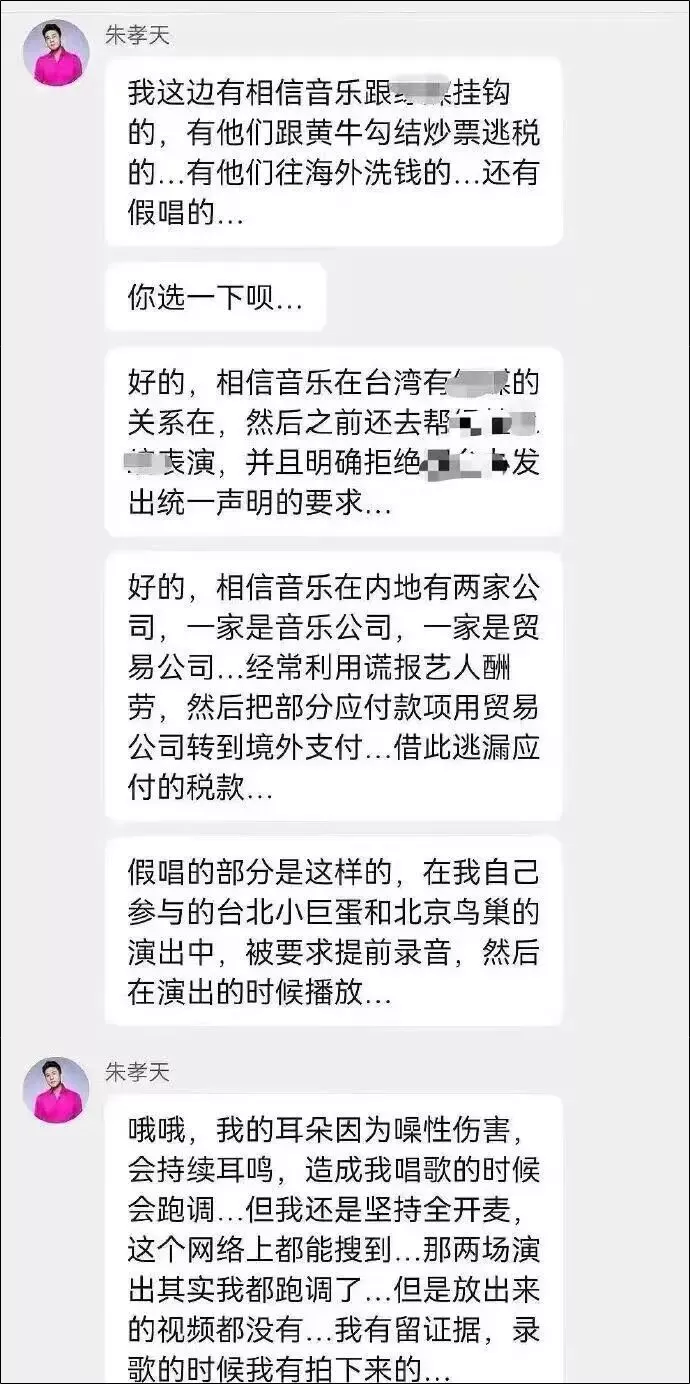 他在粉丝群中爆料:五月天所属经纪公司“相信音乐”涉嫌多项违规行为,包括勾结黄牛炒票、通过跨境贸易公司转移资金逃税、强制艺人假唱,甚至牵涉立场问题。