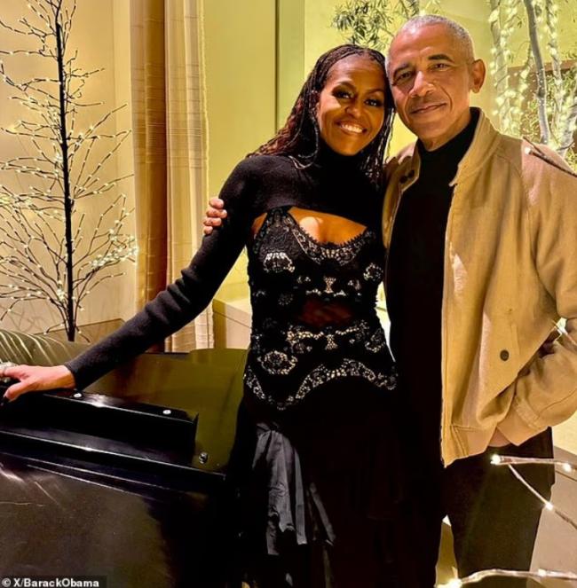 可以看到,64岁的奥巴马穿得非常休闲,卡其色夹克搭配黑色毛衣和长裤,尽显酷帅风范。61岁的米歇尔则穿着一件黑色蕾丝连衣裙,搭配同色系高领开衫,看起来非常优雅。