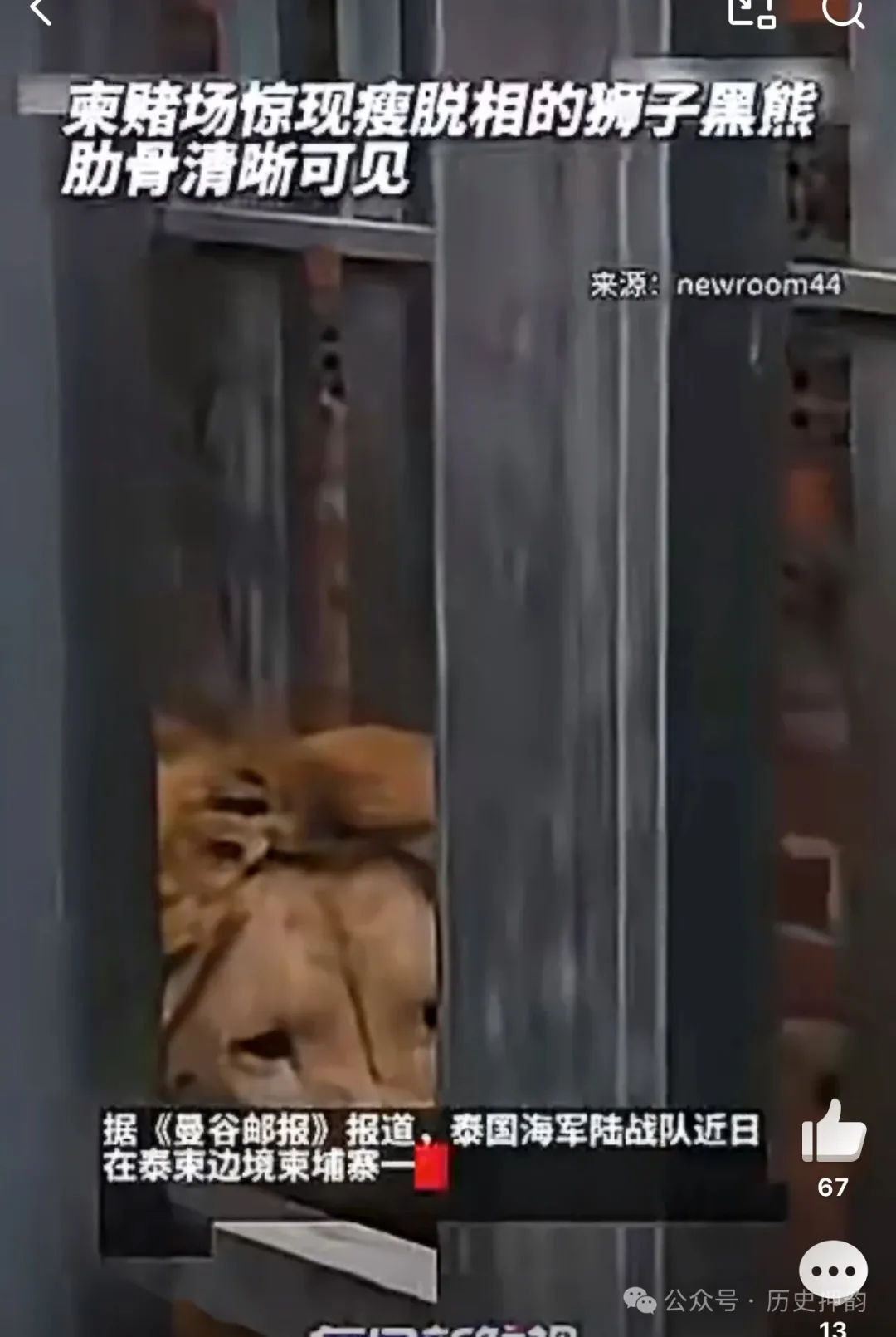 泰柬冲突打了这么久,我都从泰国回到国内了,战场也越来越胶着,还没有停下来的意思,有人想去调停,也不好使。 很多电诈园区被炸,那些电诈分子匆忙跑路,留下没有投喂的猛兽。 柬埔寨的赌场园区养这么多狮子黑熊干嘛呢?想想还挺恐怖的。 回到泰柬冲突的战场上来,根据泰国中文社的报道,柬埔寨现在的打法很有点哈马斯的感觉。 柬埔寨居民拍到军方在社区内发射火箭炮攻击泰国。
