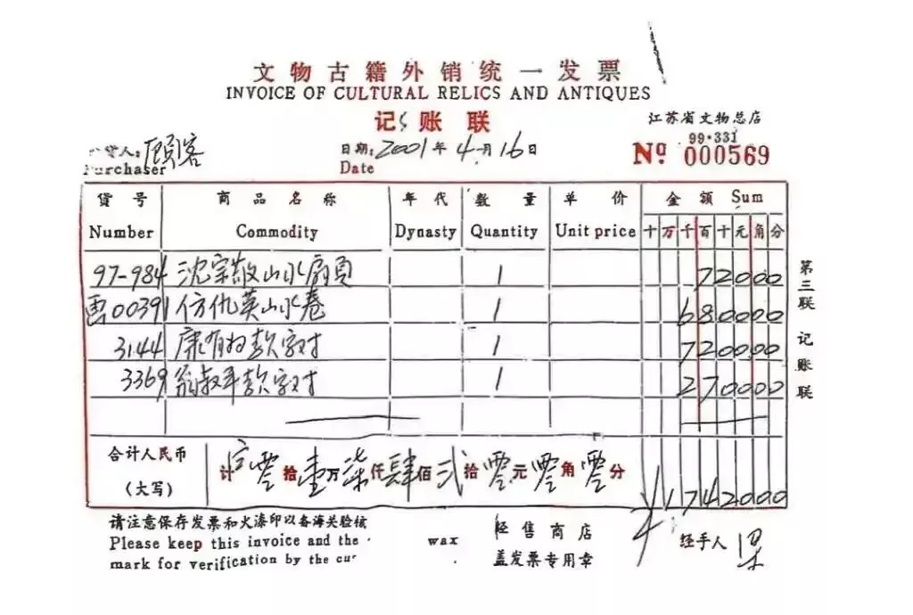 原江苏省文物总店销售发票显示,《仿仇英山水卷》于2001年4月16日被“顾客”以6800元价格购买。 图源:上观新闻