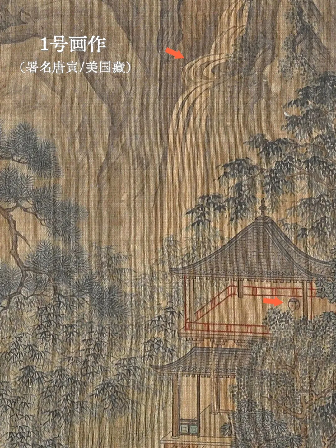 这两幅画太诡异了,构图高度相似,“你那边有的树,我这边一棵不少”,就连瀑布跌落的层数都一模一样。即使两位画家有心切磋画艺,也没必要画得如此雷同。