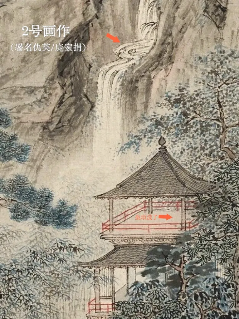 2号画作是庞家后人捐给南京博物院的《江南春图》,画在纸上,署名“仇英”。