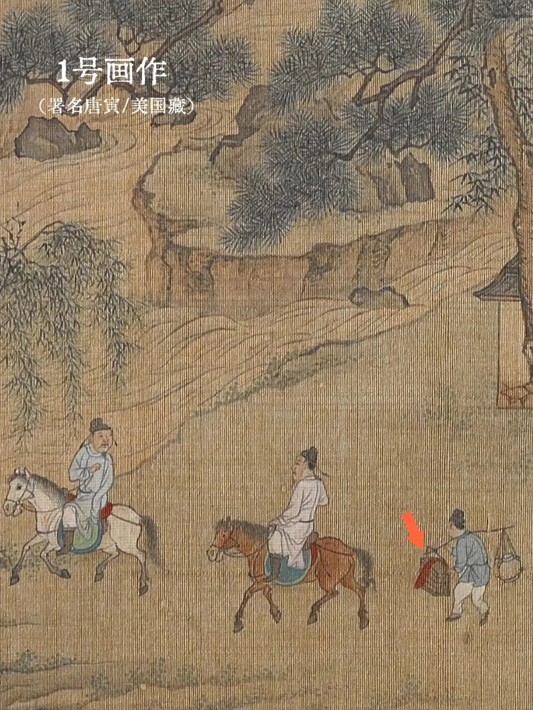 1号画作是网友“菊斋”发现的,收藏在美国印第安纳波利斯艺术博物馆(Indianapolis Museum of Art),老外起的画名是《水村行旅图》(Travellers in a Riverside Village)。作品画在绢上,署名“唐寅”——重要的事情再说一遍,署名唐寅,不是仇英。