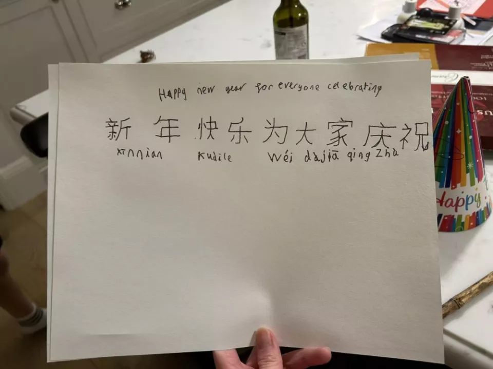 晚饭后,孩子们兴致勃勃地提议要学中文表达祝福。哥哥拿出一张白纸,打开翻译器,一笔一划地描出方块字。雇主拉着弟弟一起,录了“新年快乐”的祝福视频。