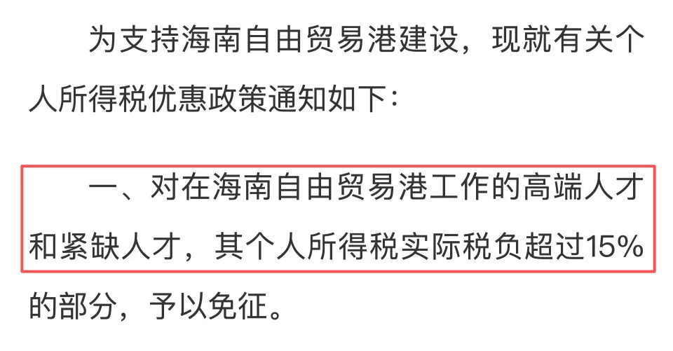 其次,内地个税最高档是45%,在海南,对高端人才和紧缺人才实际税负超过15%的部分直接免征。