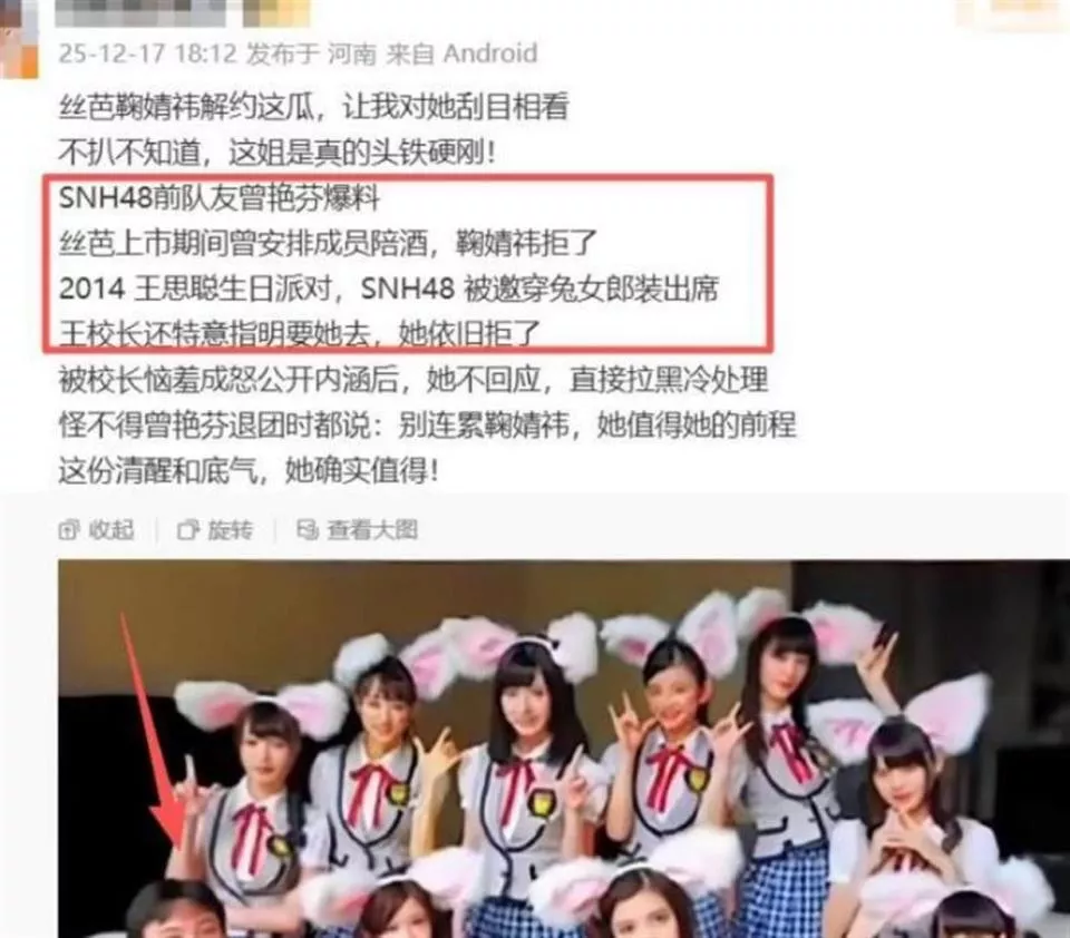 王思聪的争议并不仅限于私人情感领域。 2024年底,艺人鞠婧祎与其经纪公司上海丝芭文化传媒集团发生合约纠纷。 在双方各执一词之际,一位自称是鞠婧祎前队友的人士在网络上爆料,将一桩旧事重新带入公众视野。 该爆料指出,早在2014年王思聪的生日派对上,他曾点名要求当时已是SNH48成员的鞠婧祎前来作陪,但遭到了鞠婧祎的拒绝。