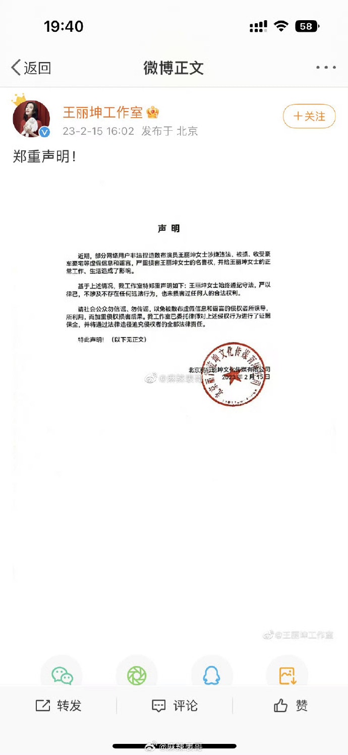 至于王丽坤方面,去年,有报道指王丽坤正与詹某某办理离婚手续,王丽坤所属工作室亦曾发声明,否认王丽坤涉及犯罪,“王丽坤女士始终遵纪守法,严以律己,不涉及不存在任何违法行为,也未损害过任何人的合法权利。”