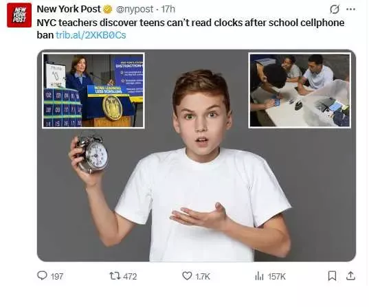根据外媒报导,纽约市多所高中教师近期反映,手机被禁止带进校园后,课堂上最常听到的一句话就是“老师,现在几点?”。一名任教于曼哈顿的高中英文老师指出,学生迫切想知道下课还剩多少时间,却对墙上的时钟毫无概念,最后她甚至得反问学生“哪一根是大指针、哪一根是小指针”。