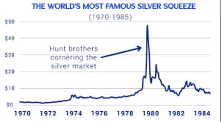 据AdvisorPedia回顾,上世纪70年代,Nelson、Lamar和William Hunt三兄弟为了对冲通胀和美元贬值,囤积了超过2亿盎司的白银,价值逾45亿美元。他们利用期货市场的杠杆效应,以极低的成本控制了巨大的头寸,推动白银价格从1973年的1.50美元飙升至1980年初的近50美元。